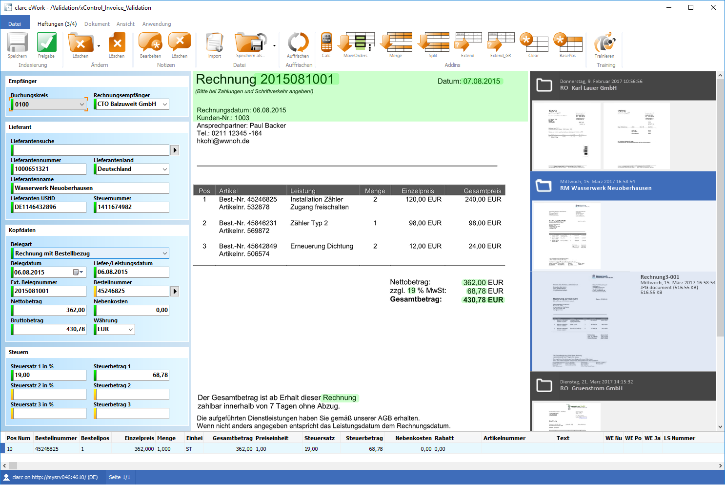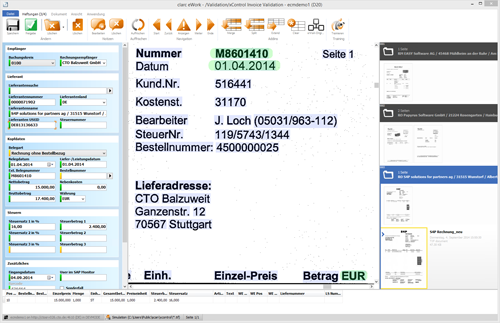 Die Rechnungsverarbeitungs Lösung erfasst Ihre Eingangsrechnungen und übergibt automatisiert relevante Daten direkt an das Dokumentenmanagementsystem. Verarbeiten Sie Ihre Rechnungen automatisert. Rechnungsprozesse bergen viel Potenzial durch die Digitalisierung. Durch Ihre standardisierten Layouts können Sie gut ausgelesen und automatisiert weiterverarbeitet werden. Rechnungen werden so einsgescannt, OCR indiziert und ausgelesen. Metadaten wie zum Beispiel Rechnungsnummer, Lieferantennummer, Beträge, Bestellnummern, Artikel uvm. werden zur Rechnung abgespeichert.