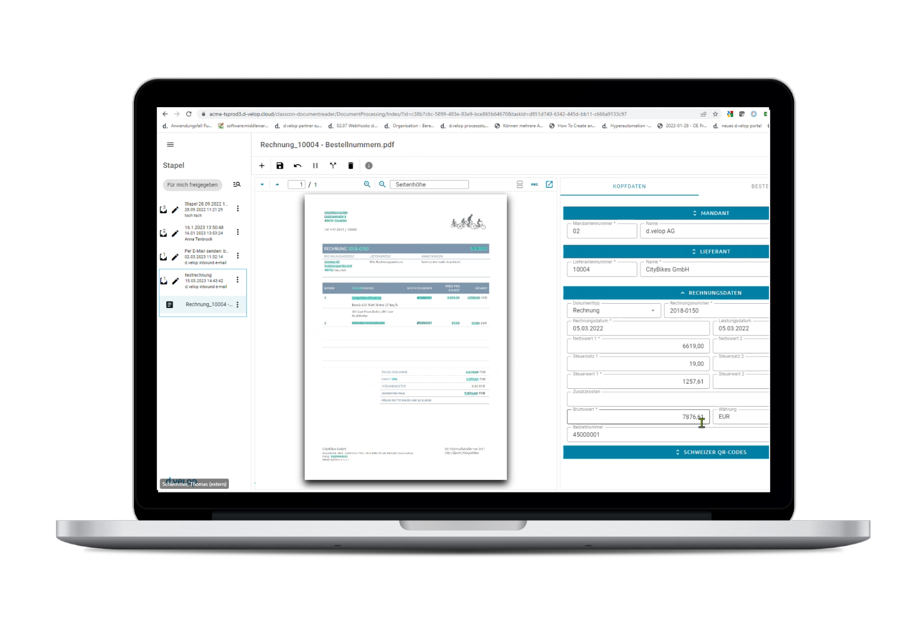 | Funktionen: | Abgleich von bestellten und gelieferten Mengen, Automatische Extraktion von grundlegenden Rechnungsdaten mittels KI, Automatische Kategorisierung von Rechnungen in Stapeln mittels KI , Automatische Rechnungstrennung bei Stapeln mittels KI , Automatisches Auslesen von ZUGFeRD-Rechnungen, Automatisches Auslesen von xRechnungen, E-Mail-Eingangspostfächer , Nachbearbeitungsfunktionen für neu erfasste Rechnungen, Prüfung/Validierung von Metadaten gegen Stammdaten, Prüfung der erkannten Informationen auf formelle Richtigkeit nach UStG , REST-API (Schnittstelle) für Importe von Rechnungsstapeln , Rechnungseigenschaften mit Barcodes/QR-Codes übermitteln , Rechnungserfassung per Scan , Rechnungserfassung per Upload , Rechnungstrennung mit Barcodes/QR-Codes, Stapelbasierte Erfassung mehrerer Rechnungen |