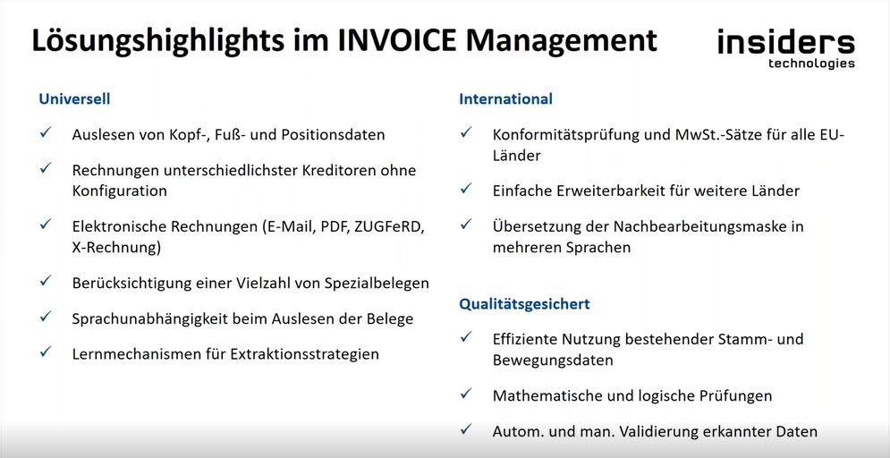 Performante, effiziente und qualitätsgesicherte Verarbeitung aller eingehenden Rechnungen, optimale Prozesse im gesamten Rechnungswesen, deutlich verkürzte Durchlaufzeiten eingehender Rechnungen, enorme Kosten- und Zeiteinsparungen sowie spürbare Qualitätsverbesserungen und umfassende Transparenz über den gesamten Rechnungsprozess.
